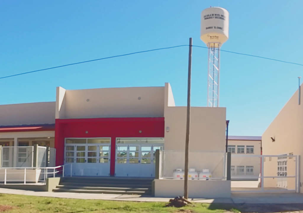 Escuela Nivel Inicial, Medio y Secundario en dos plantas, laboratorios, aulas, salón de usos múltiples, áreas de servicios. Sistema constructivo tradicional, estructura de HºAº, mampostería de ladrillos cerámicos, cubiertas de chapa, cielorrasos placa yeso y pvc, carpinterías de aluminio, pisos graníticos y de HºAº.